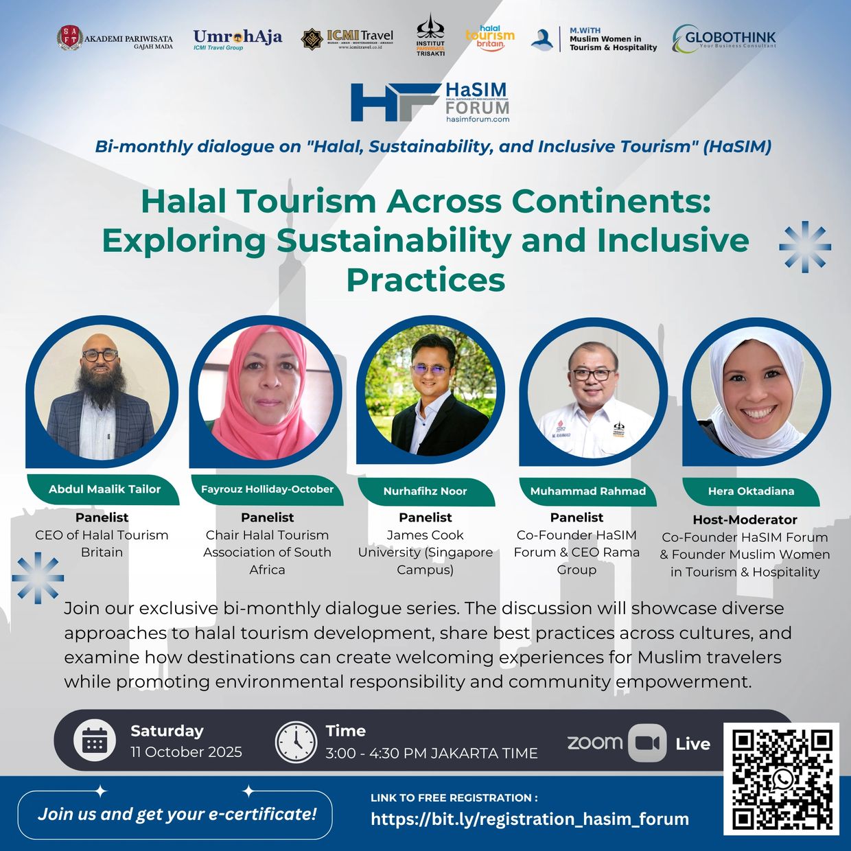 This inaugural HASIM dialogue brings together halal tourism experts from South Africa, Australia, Singapore, Britain, and Indonesia—to explore how different regions are successfully integrating halal-conscious practices with sustainability and inclusivity. The discussion will showcase diverse approaches to halal tourism development, share best practices across cultures, and examine how destinations can create welcoming experiences for Muslim travelers while promoting environmental responsibility and community empowerment.